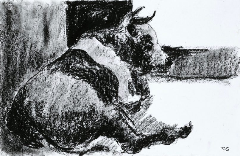 « Là où on tue les taureaux, il y a beaucoup de bruit, tandis que leurs râles se confrontent aux gazouillements des moineaux posés sur les encadrements de fer des fenêtres carrées.
